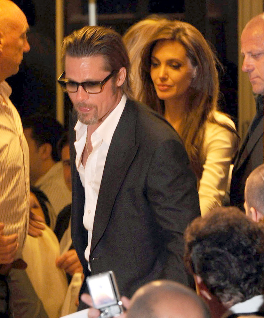These are some new photos of Brad Pitt and Angelina Jolie out to dinner in Cannes last night. Brad seems to be wearing a charcoal-colored suit, white shirt and no tie, with his hair slicked back into some kind of fancy mullet (praise it). Angelina seems to be wearing a fitted white v-neck dress that I would like to see more of - it looks flattering, and very much UNLIKE the sack dresses she prefers for the red carpet. I could be wrong, but I thought I also spied a classic Louis Vuitton monogram purse in her hand too. Angelina was recently shooting the LV ads with Annie Leibovitz in Cambodia, and I can't wait for those to come out.