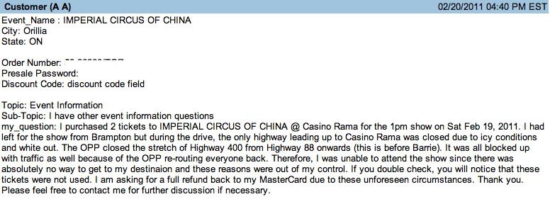 I can't believe Casino Rama puts up with Ticketmaster as their sole venue partner and won't compensate patrons. Patrons attending Casino Rama concerts provide revenue to the casino. So personally I feel Casino Rama should take partial responsibility in making sure their customers are satisfied - but they don't. So anyways, since the Ticketmaster supervisor on the phone kept stating that the event was over and because the event is over there is nothing to be done. I asked her, "well what did you want me to do? Call you while on the highway while the highway was closed down to let you know I can't attend the event in an hour's time?" You know, you're not allowed to talk on the phone here while you're driving - it's a law provincial law. I asked her anyways what difference it would have made if we pulled over the car and called Ticketmaster while stuck on a closed highway. She could not give me a proper answer. The supervisor was really rude and losing her patience with me because she knew how stupid her reasoning was (and at the same time I guess she was pissed that my questions and inquiries were both legitimate and reasonable). I told her I would complain online and that there are a lot of boards complaining about ticketmaster. She said, "fine" and pretty much hung up.